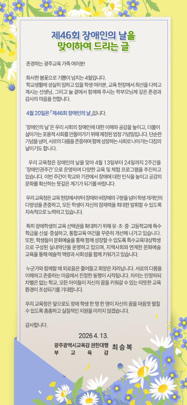 - 광주창의융합교육원, ‘찾아가는 영어체험’ 운영 - 12월까지 중·고등·특수학교 원어민교사 방문수업 - 고교학점제 연계 영어토론 등 맞춤형.. 2026.04.01