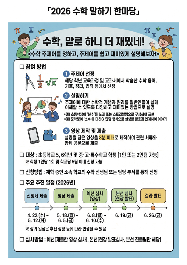 - 새글 「2026 수학 말하기 한마당」신청 안녕하십니까?학생들의 수학에 대한 흥미와 자신감 고취 등을 위해 마련된 수학 말하기 한마.. 2026.04.22